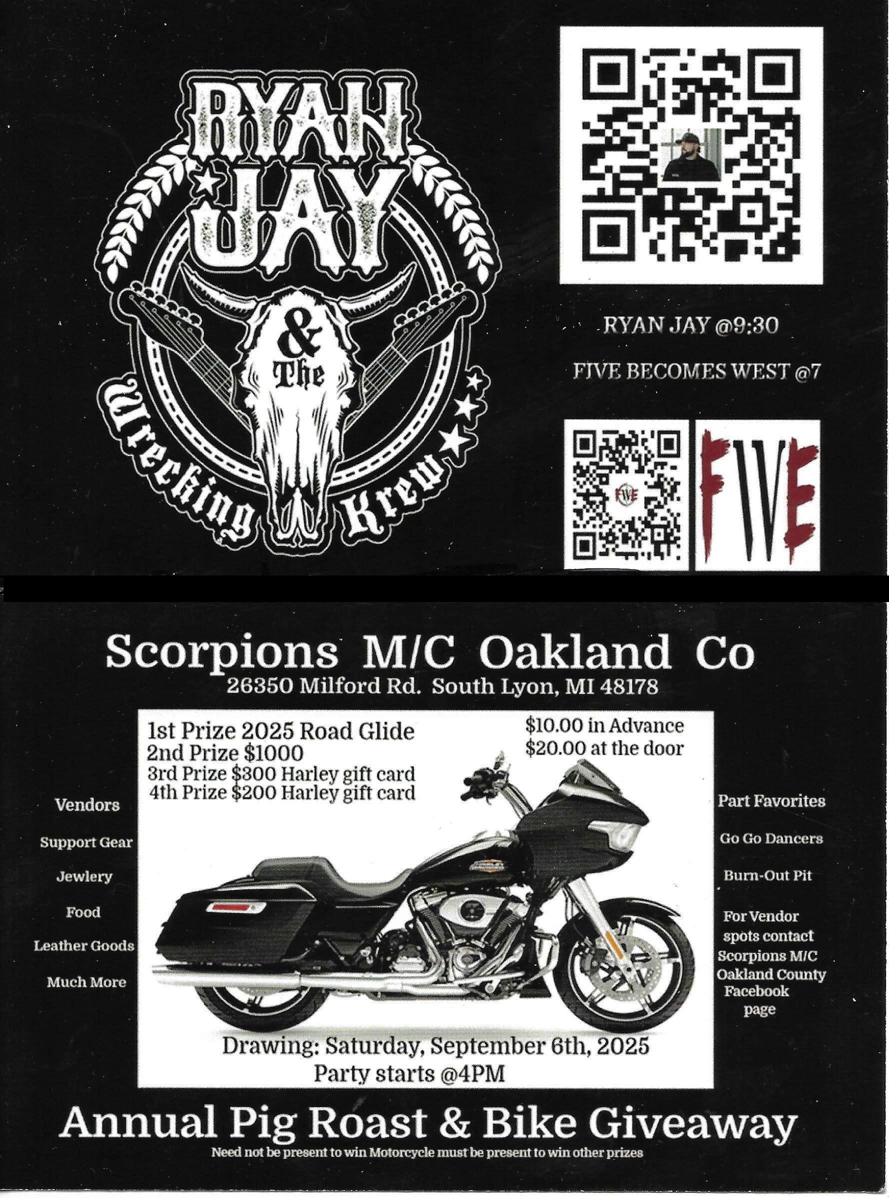21 March 2026 — MCOC Annual Fundraiser Party and Raffle — Scorpions MC Oakland County on Milford Road